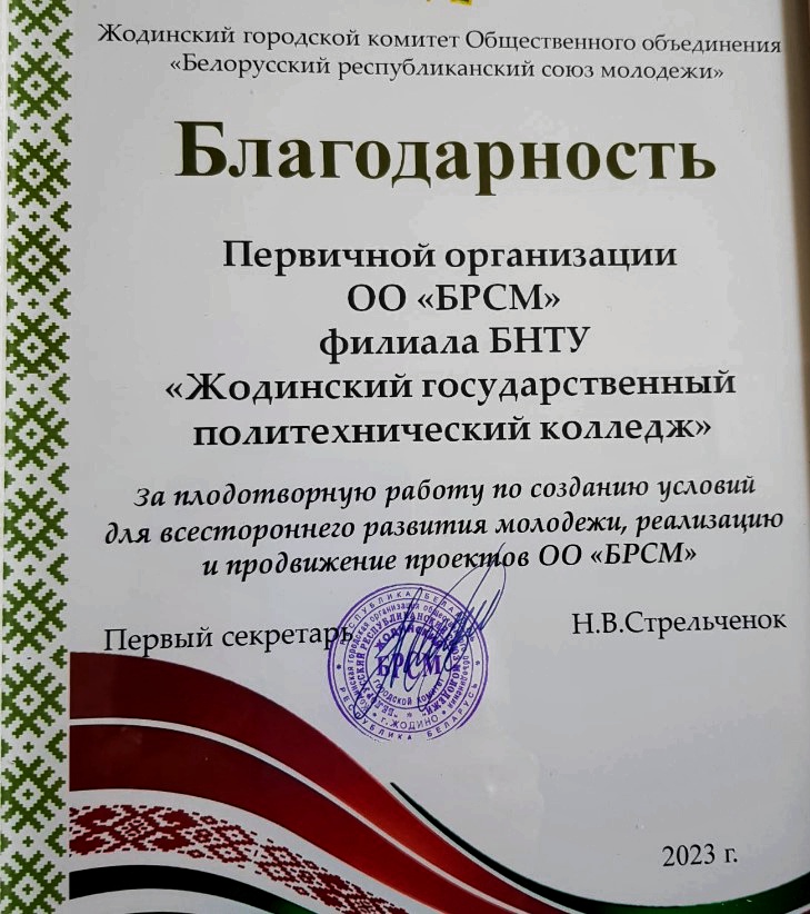 7 апреля активисты ПО "БРСМ" приняли участие в расширенном заседании XI Пленума Жодинской городской организации ОО "БРСМ" . На мероприятии были обсуждены ключевые тезисы из Послания Президента Республики Беларусь с участием депутата Палаты представителей Национального собрания Республики Беларусь Стрельчёнка В.И. 🇧🇾В конце мероприятия ПО "БРСМ" колледжа была объявлена благодарность за плодотворную работу по созданию условий для всестороннего развития молодёжи и реализацию и продвижение проектов ОО"БРСМ"